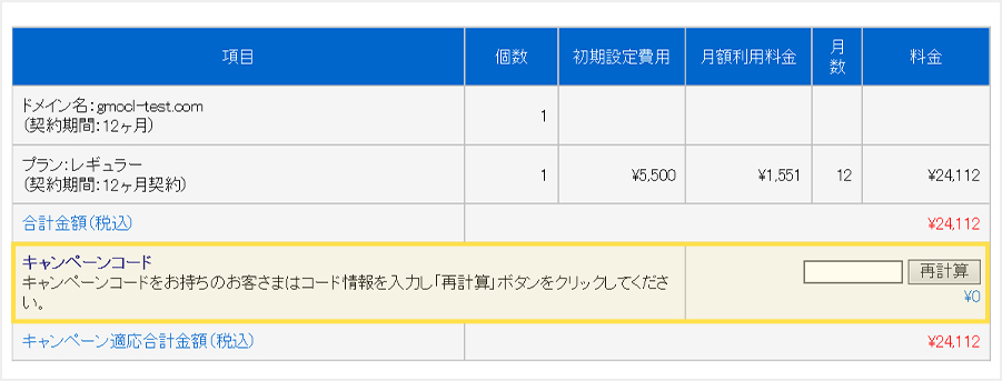 アカウントマネージャーにログインして、お申し込みます。「キャンペーンコード」欄にキャンペーンコードを入力し、「再計算」ボタンをクリックします。割引価格が適用されます。